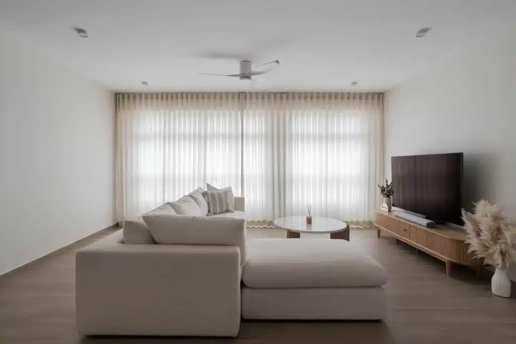 The living room pictured above shows how we create a scandinavian home that feels warm, using wide windows for light, a calm palette, rounded furniture and natural textures tailored to Malaysian landed homes and condos.